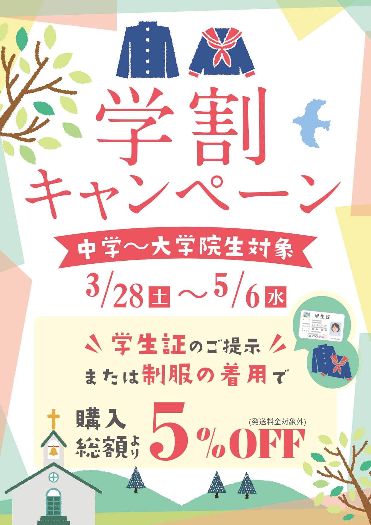 期間中、学生証のご提示または制服でのご来店にて、購入総額より5%OFFにてご案内いたします。新生活のスタートやご旅行、お友達とのひとときに。。